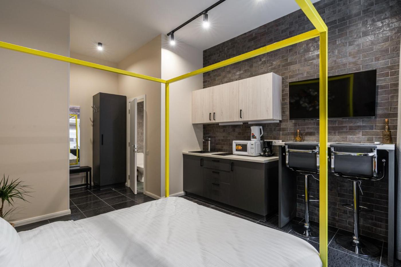 King Studio with Sofa Bed. The studio includes a private bathroom equipped with a shower, a hairdryer and slippers. In the fully equipped kitchenette, guests will find a stovetop, a refrigerator, kitchenware and a microwave. The air-conditioned studio provides a flat-screen TV with cable channels, a washing machine, a tea and coffee maker, a wardrobe as well as city views. The unit offers 2 beds. ;