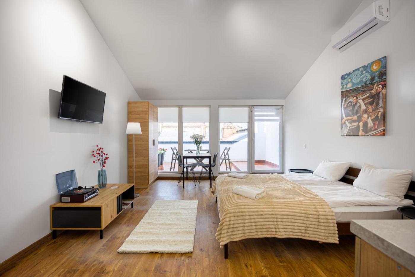 One-Bedroom Apartment with View. The apartment features 1 bedroom and 1 bathroom with a shower and free toiletries. In the kitchen, guests will find a stovetop, a refrigerator, a microwave and a toaster. This apartment has a washing machine, a coffee machine, a flat-screen TV with streaming services and city views. The unit offers 1 bed. ;