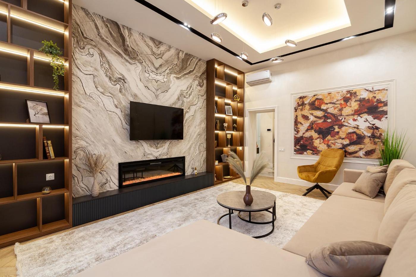 Two-Bedroom Apartment. Guests will have a special experience as the apartment offers a fireplace. This spacious apartment consists of 1 living room, 2 separate bedrooms and 1 bathroom with a shower and free toiletries. Guests can make meals in the kitchen that is equipped with a stovetop, a refrigerator, a dishwasher and kitchenware. The air-conditioned apartment provides a flat-screen TV, a washing machine, a seating area, a dining area as well as city views. The unit offers 3 beds.